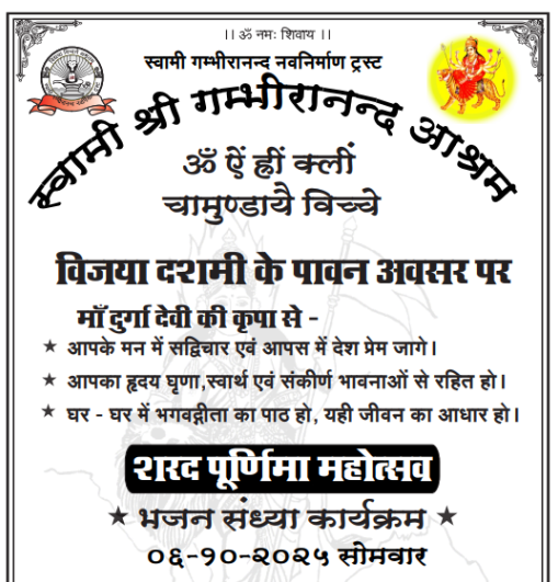 Based on the ideology of Swami Shree Gambhiranand Saraswati i.e. “rendering social and welfare services undertaken with a spiritual outlook”, the mission has been serving the society since its inception. It’s guiding principle आत्मानो मोक्षार्थं जगद्धिताय च (Atmano Mokshartham Jagaddhitaya Cha) meaning “for one’s own liberation and for the welfare of the world” is not only taught in the mission, but is also an integral part of the life-style of the persons under the mission.