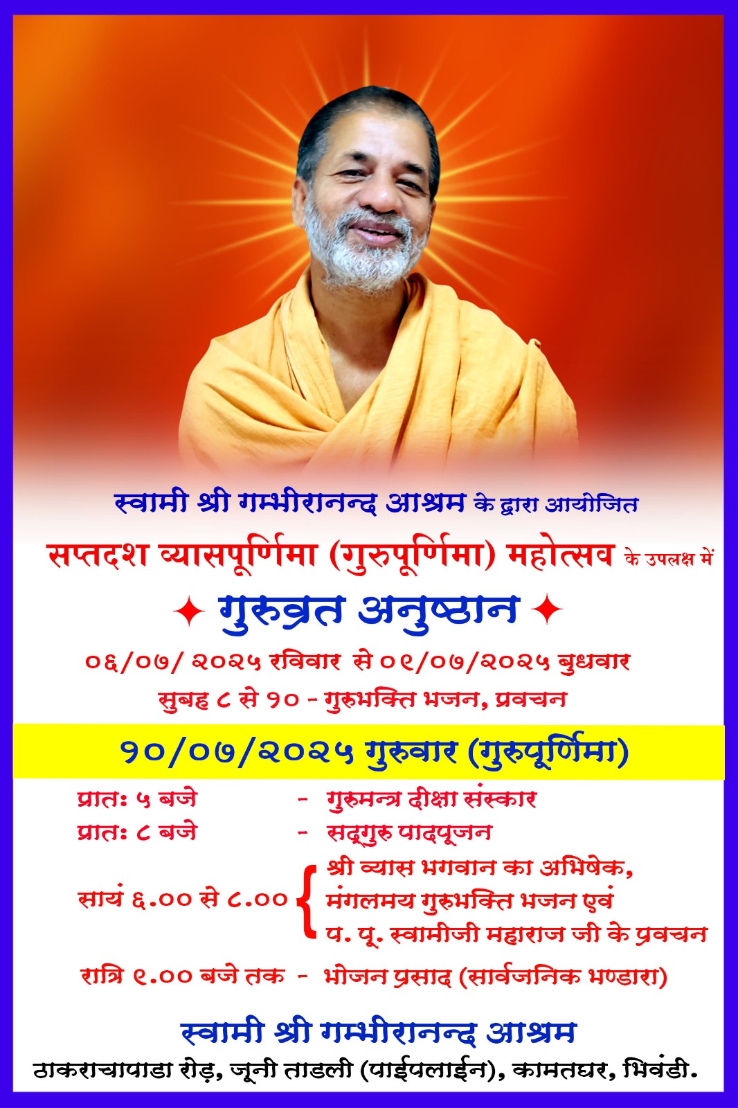 The Holy Sri Guru Purnima Celebrations and various programs will be conduct at Swami Gambhranand Ashram from 10th July,2022 to 13th of July, 2022.