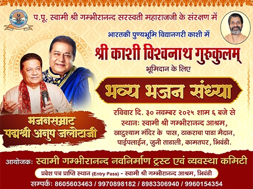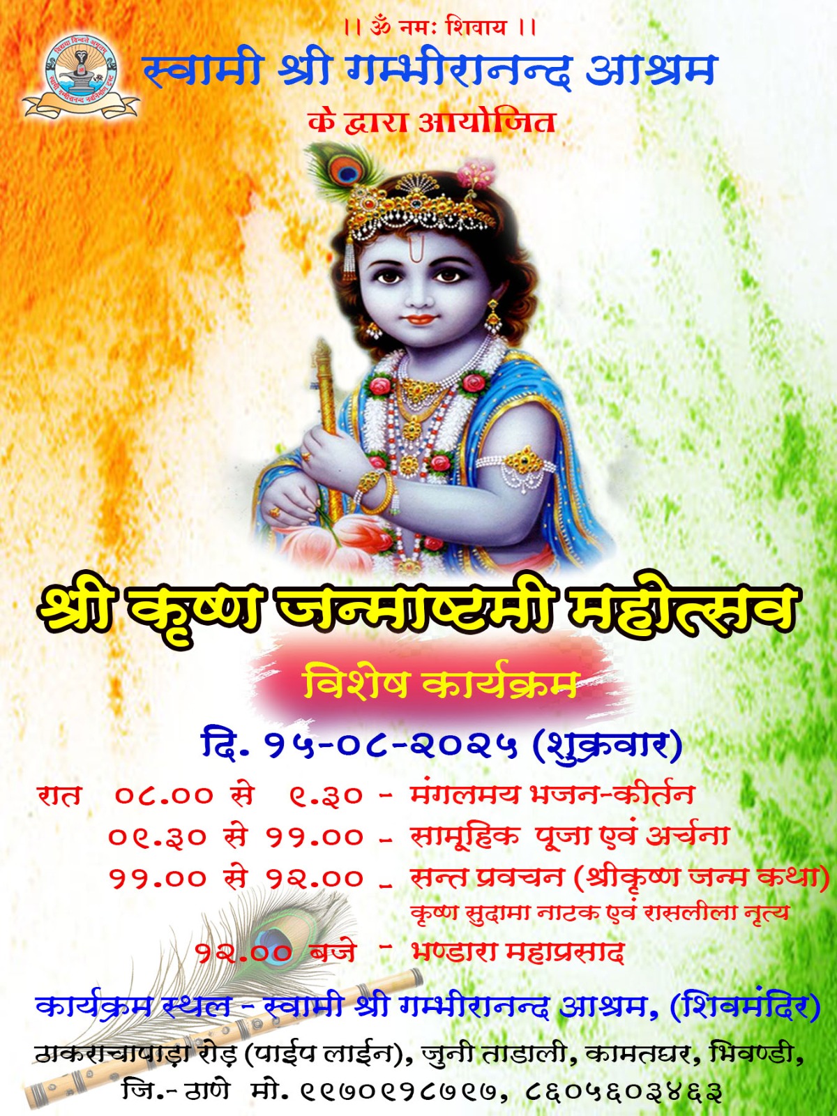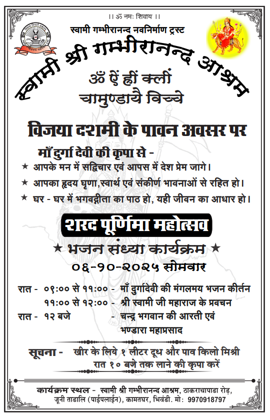 कार्यक्रम स्थल :-स्वामी श्री गम्भीरानन्द आश्रम ठाकराचापाडा रोड़, जूनी ताडली (पाईपलाईन), कामतघर, भिवंडी.संपर्क -