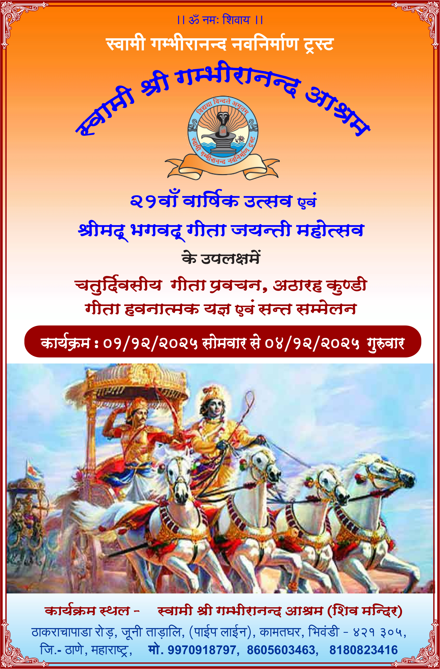Shreemad Bhagavad Gita 18 Chapters Pravchan in 18 Days, in occasion of 18th Anniversary of Swami Gambhranand Ashram at Swami Gambhranand Ashram, Bhiwandi. from 20 Nov 2022 to 07-Dec-2022 - 7.30 am to 9.30am.